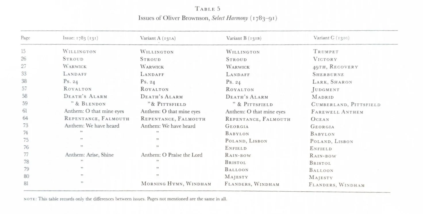74 compositions, incl. 5 anthems, 1 set-piece, & t-p. canon, for 4 voices (1 for 3); full text. Attribs. to Benham (8), Billings (6), Brown, Brownson (24), Chandler (2), Edson (2), King, Strong (7). 2 1st pr. identified (NEWPORT, WINDHAM), also 1 1st Am. pr. (PITTSFIELD). 54 American compositions, 17 non-American, 3 unidentified [Anthem: We have heard; PITTSFIELD, WILLINGTON] (51 attrib. Americans, 3 traced [KETERY, NORWICH, PSALM 33); 17 traced to non-Americans.