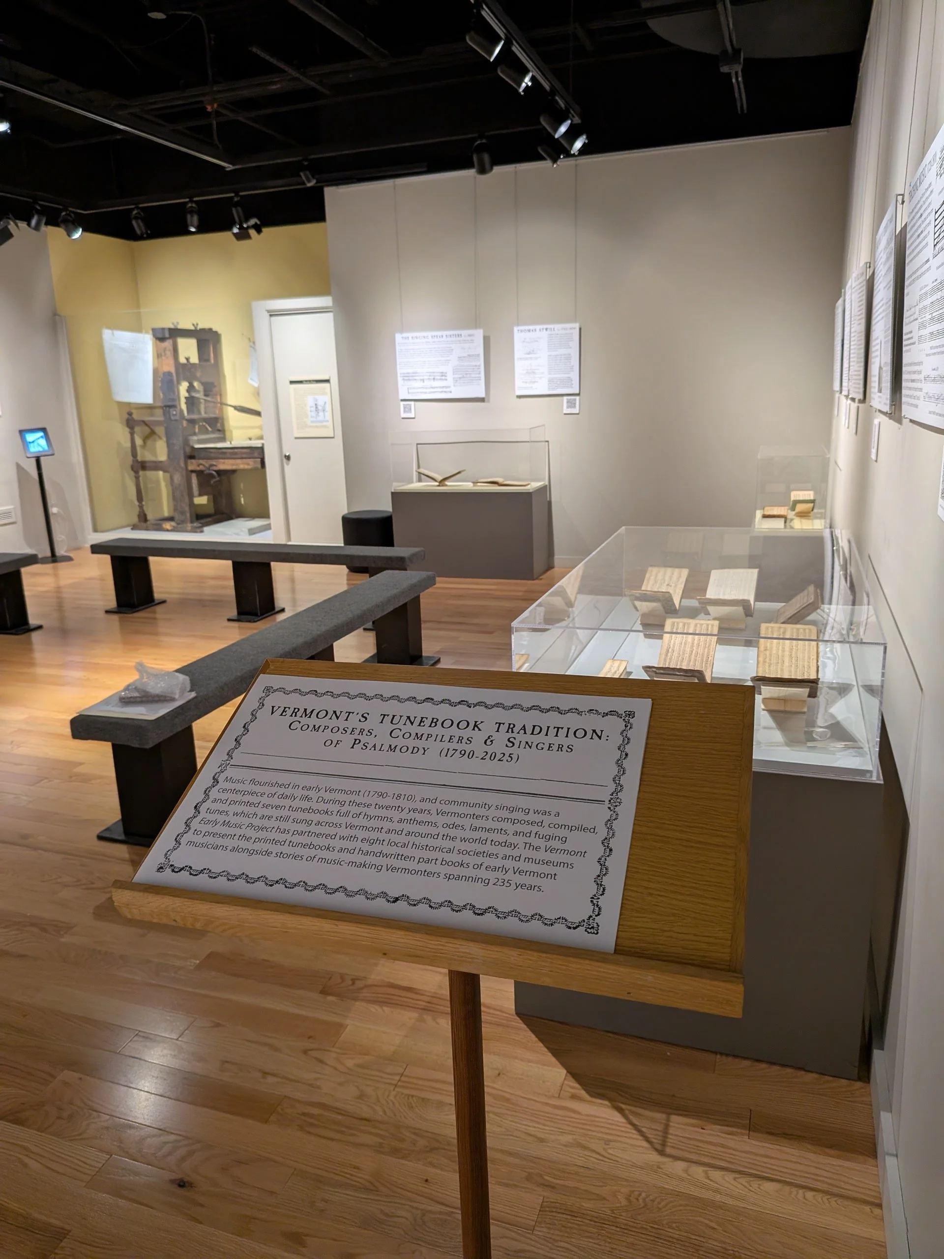 Music flourished in early Vermont (1790-1810), and community singing was a centerpiece of daily life. During these twenty years, Vermonters composed, compiled, and printed seven tunebooks full of hymns, anthems, odes, laments, and fuging tunes, which are still sung across Vermont and around the world today. The Vermont Early Music Project has partnered with eight local historical societies and museums to present the printed tunebooks and handwritten part books of early Vermont musicians alongside stories of music-making Vermonters spanning 235 years.