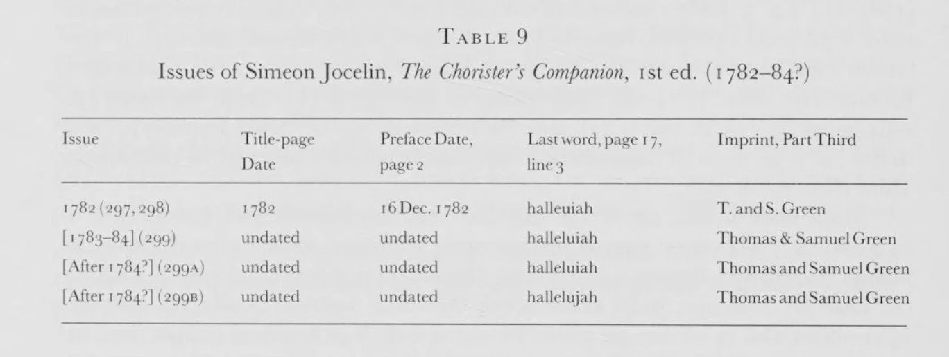 Because of their separate pagination The Chorister's Companion and Part Third are described separately here and given different numbers even though no copies of the former without Part Third have been found. The Chorister's Companion, a popular collection, was reprinted at least three times before a revised second edition appeared in 1788. The original plates were used for all post-1782 issues, and only small variations in the typeset portions distinguish these issues.