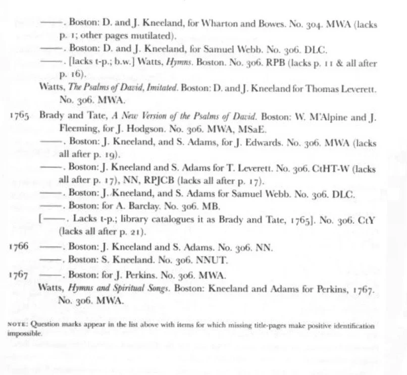 Not in Evans (MWA copy b.w. Brady and Tate, New Version, Boston, 1767, on Readex
