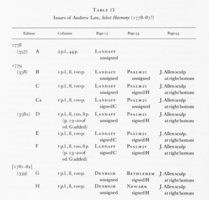 Law first published only part of Select Harmony (1778), completed it in 1779, changed the contents somewhat by the beginning of 1782, and continued to print it in this form into the 1790s. Except for the musical changes between the 1779 and 1781-82 editions-all but one of which occur on p. 13-20-the complete issues are printed from the same engraved plates. Some fifteen years after Select Harmony first appeared, Law advertised that he still had 'a small number' available. (See back cover of Law, The Musical Primer, 1793, No. 351.) As late as 1796 he signed the title-page of his The Christian Harmony, Vol. II, as 'Author of the Select Harmony. An undated memo in the Law Papers, written by William Law probably in the 1790s, records the delivery of some 5,000 copies to his brother. (See Crawford 1968, p. 23.) At least fourteen separate printings can be distinguished. (See Table 13.)