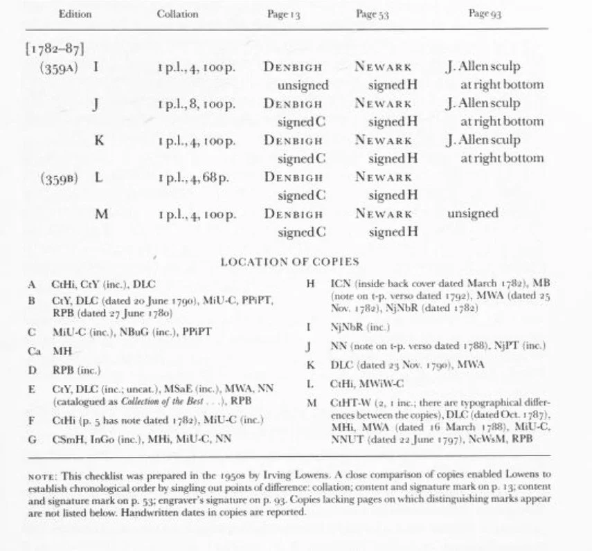 NOTE: The welter of bibliographical ghosts and mistaken editions lurking in the canon of this, the first copyrighted American tunebook, illustrates the fluid state of copyright procedure in the 1780s and early 1790s. Evans 18553 is an unauthorized 1784 piracy actually published by Daniel Bayley (q.v., No. 79). Evans 19754 claims a 1786 edition, which turns out to be merely a Maryland state copyright of the edition of 1781-82 (No. 359). (See Lowens 1959, p. 152.) Evans 23429 & 24467 claim editions of 1791 and 1792. No evidence of new editions in either of these years has been found; surely the first was Law's federal copyright of the work-a national copyright act had been passed in 1790-but why he obtained another the next year is not known. Finally, Evans 16317, the so-called Collection of the Best and Most Approved Tunes and Anthems is actually Select Harmony (1779; No. 358), mistaken for a separate collection.
