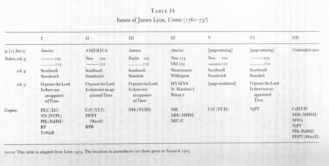 Sonneck 1905, p. 137-47, distinguishes between printings of Urania. In Lyon 1974, Richard Crawford adds a few details to Sonneck's findings (see p. xxiii-xxv), and the table of printings given there is adapted as Table 14 here.